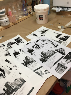 As may or may not know, in order to transfer my many photographs to my panels I use a technique called image transfer, a technique where acrylic medium picks up the ink from a laser print after which the paper is taken away which leaves you with a clear acrylic sheet called a gel skin. Because my pieces are quite large, I like to print on 11"x17" or A3 sized paper. In Canada I had a large format inkjet photo printer, I would print my images and bring them to a copy shop to have them copied on a particular type of paper by a laser printer.